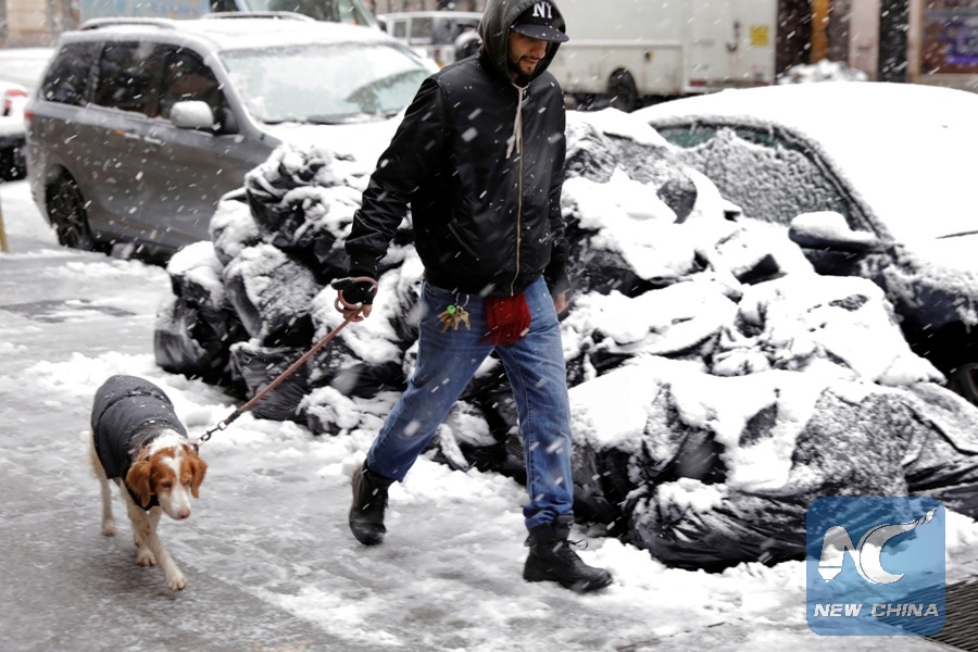A man walks with his dog during a snow storm in New York, U.S., March 7, 2018. (Xinhua/REUTERS)