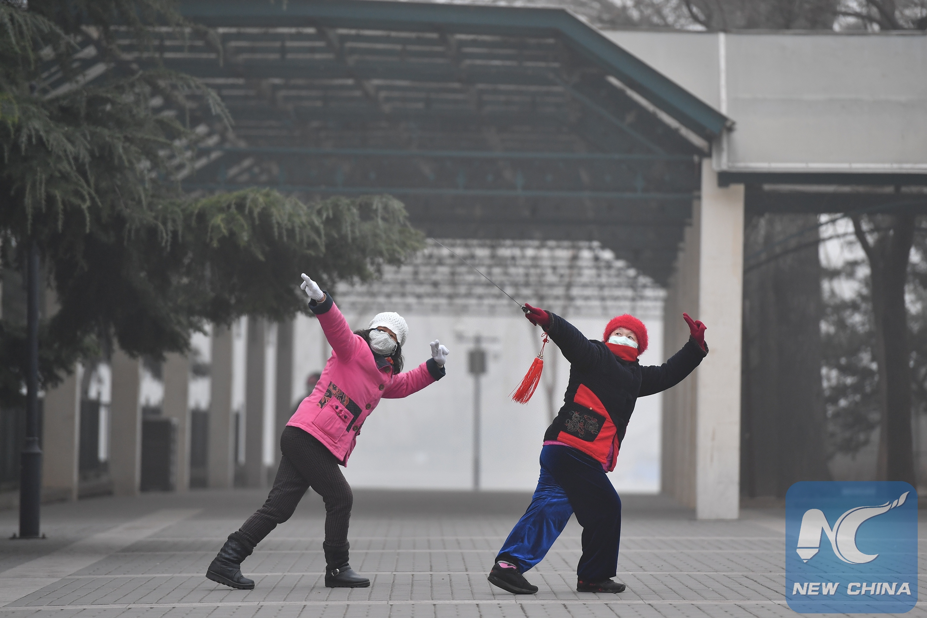 Two citizens do morning exercises at the Taoranting Park in Beijing, capital of China, Dec. 21, 2016. (XINHUA/Li Xin)