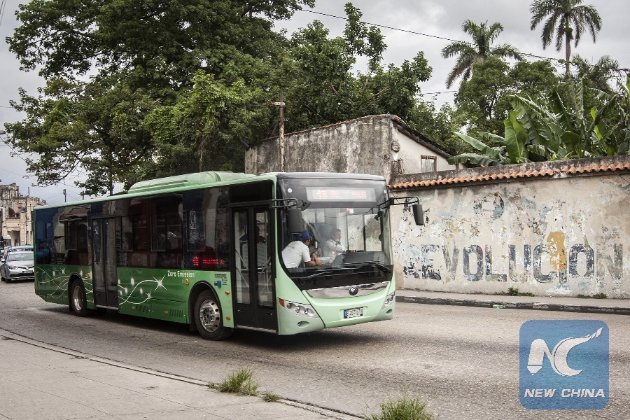 Photo taken on Nov. 27, 2017 shows the first electric bus in Cuba of the Yutong Company, in Havana, Cuba. A singular green bus manufactured by a Chinese company has been circulating the streets of Havana for several days, marking a milestone in Cuba's history of public transportation. (Xinhua)