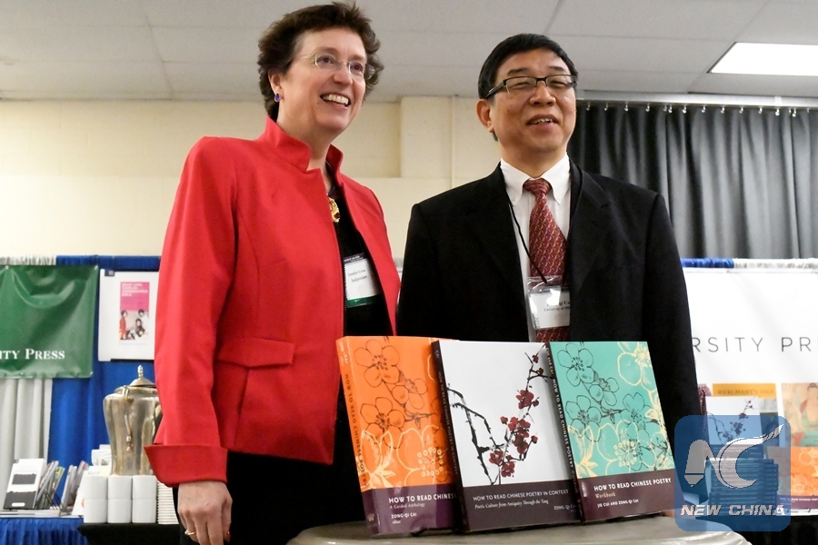 Jennifer Crewe (L), associate provost and director of Columbia University Press, and Cai Zongqi (R), professor of Chinese and Comparative Literature Department of East Asian Languages and Cultures, University of Illinois, launched a book series named "How to Read Chinese Literature" together in Washington D.C., on March 23, 2018. (Xinhua/Yang Chenglin)