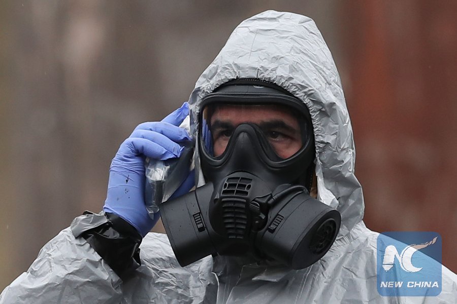 A military personnel speaks on a device wearing protective coveralls as he works to remove vehicles from a cordoned off area behind a police station in Salisbury, southern England, on March 11, 2018, as investigations and operations continue in connection with the major incident sparked after a man and a woman were apparently poisoned in a nerve agent attack a week ago. (Xinhua/AFP)