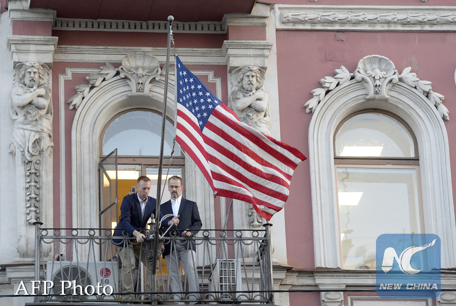 US consulate's employees remove the US national flag from the balcony of the US Consulate in Saint Petersburg on March 31, 2018. (AFP PHOTO)