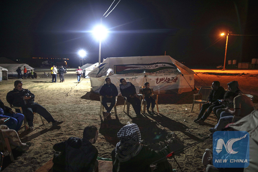 GAZA, April 3 (Xinhua) -- Around 70 white tents lined on the open field in eastern Gaza Strip near the Israeli border, turning the area, the scene of recent bloody Israeli-Palestinian clashes, into a big picnic-like party in Spring.