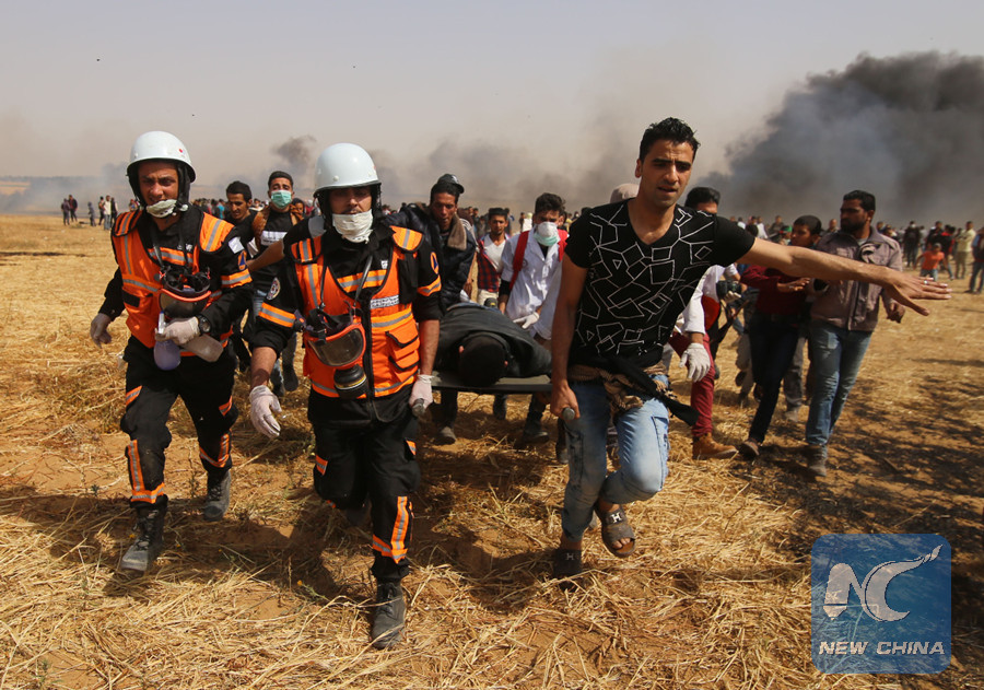 Al-Qudra told Xinhua that 21 paramedics had been wounded by Israeli army's gunfire and dozens injured from tear gas near the Gaza border since the outbreak of the protests.