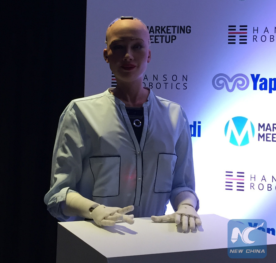 Sophia, the world's first robot citizen, joins a marketing meeting in Istanbul on April 19, 2018 and answers questions. (Xinhua photo/Yi Aijun)