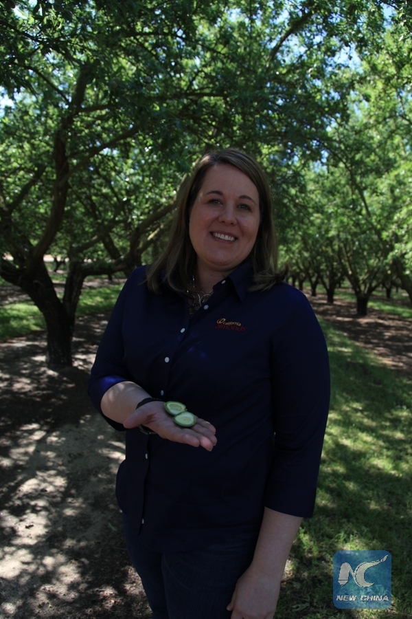 Photo taken on April 25, 2018 shows Emily Fleischmann, Senior Director of Global Marketing for the California Almond Board, in Modesto, the United States. (Xinhua/Gao Shan)