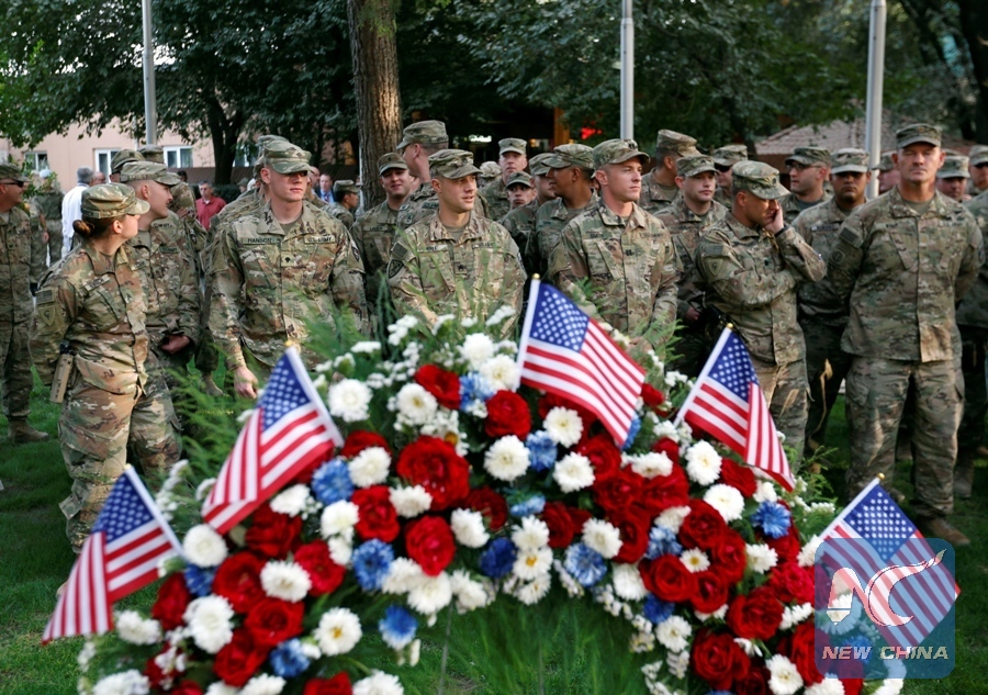U.S. soldiers take part in a memorial ceremony to commemorate the16th anniversary of the 9/11 attacks, in Kabul, Afghanistan, Sept. 11, 2017. (Xinhua/REUTERS)