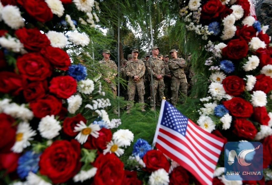 U.S. soldiers take part in a memorial ceremony to commemorate the16th anniversary of the 9/11 attacks, in Kabul, Afghanistan, Sept. 11, 2017. (Xinhua/REUTERS)