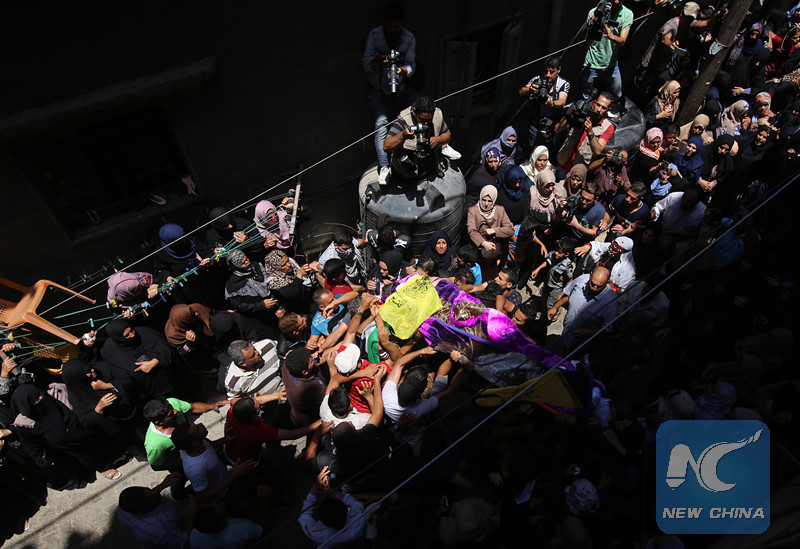 Mourners carry the body of Razan al-Najjar during her funeral in the southern Gaza Strip City of Khan Yunis, on June 2, 2018. (Xinhua/Khaled Omar)