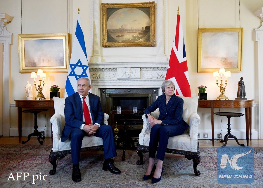 LONDON, June 6 (Xinhua) -- British Prime Minister Theresa May told Israeli Prime Minister Benjamin Netanyahu at Downing Street on Wednesday that Britain was firmly in support of the Iran nuclear deal following U.S. President Donald Trump's pulling out of the deal.