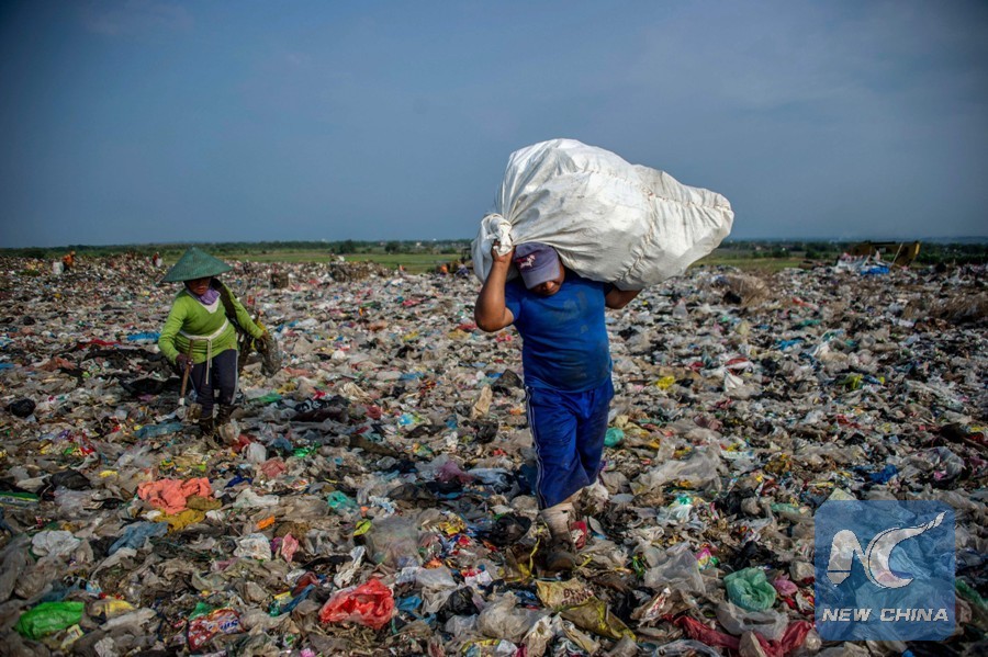 Scavengers collect valuable waste at Sidoarjo garbage dump in East Java, on June 5, 2018. (Xinhua/AFP)