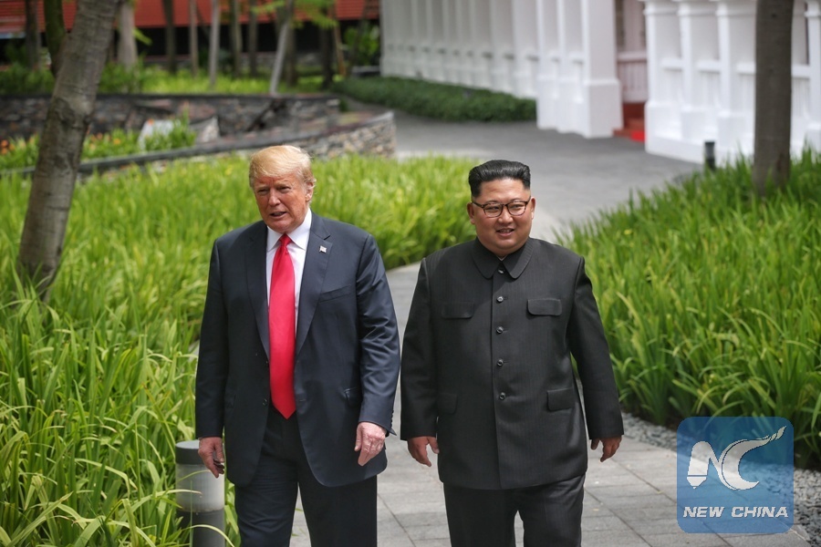 Top leader of the Democratic People's Republic of Korea (DPRK) Kim Jong Un (R) and U.S. President Donald Trump take a walk during their summit meeting in Singapore on June 12, 2018. (Xinhua/Ministry of Communication and Information of Singapore)