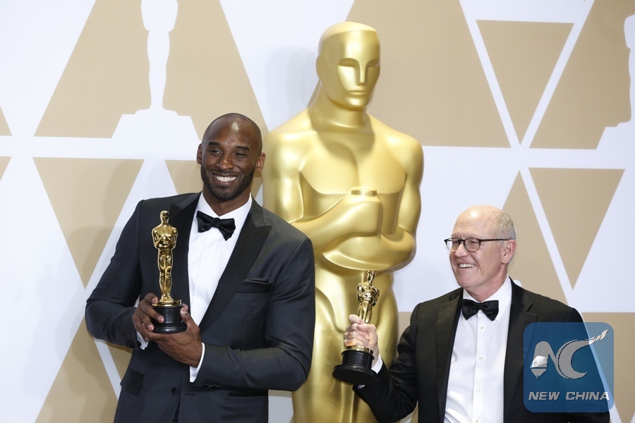 Former U.S. basketball player Kobe Bryant (L) and director Glen Keane pose after winning the Best Animated Short Film award for "Dear Basketball" at press room of the 90th Academy Awards at the Dolby Theater in Los Angeles, the United States, on March 4, 2018. (Xinhua/Li Ying)