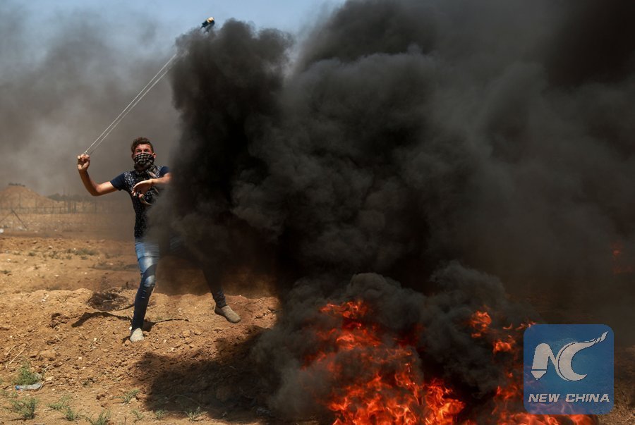 A Palestinian protester uses a slingshot to hurl stones at Israeli troops during clashes, on the Gaza-Israel border, east of Gaza City, on June 8, 2018. (Xinhua/Stringer)