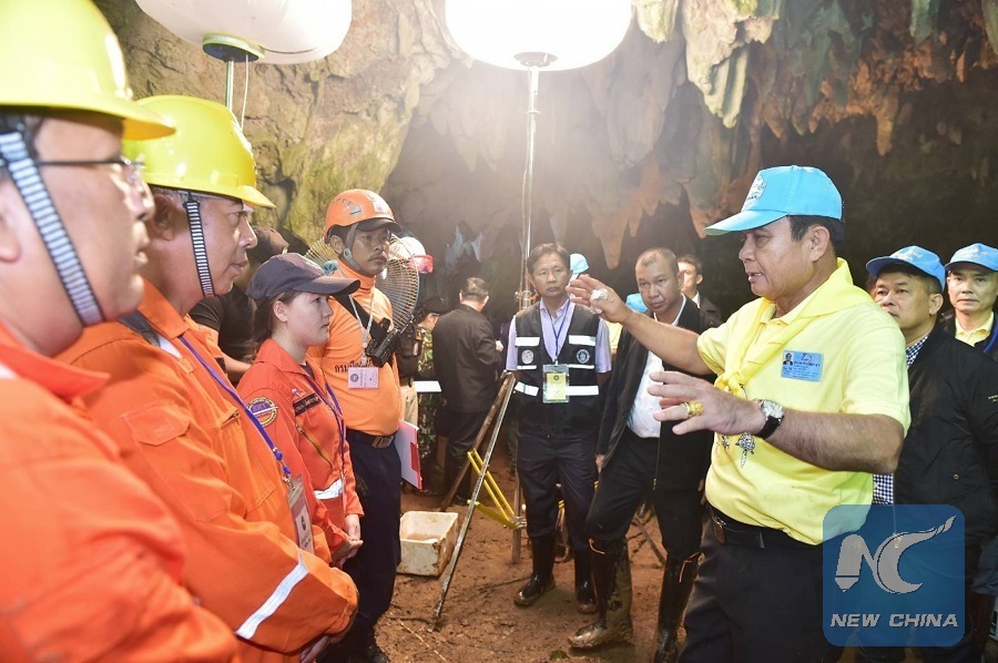 Thai Prime Minister Prayut Chan-o-cha (3rd R) speaks to the rescuers in Tham Luang Khun Nam Nang Non cave in Mae Sai district of Chiang Rai, north of Thailand, on June 29, 2018. (Xinhua/Han Chen)