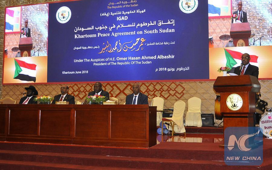 Photo taken on June 27, 2018 shows the signing ceremony of South Sudan conflicting parties in Khartoum, South Sudan, June 27, 2018. (Xinhua/ Mohamed Khidir)