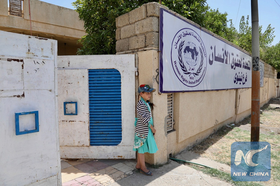 A girl whose father was captured by IS militants and went missing two years ago in Mosul, stands at the gate of the Human Rights United Organization in Nineveh Province, Iraq, on July 8, 2018. (Xinhua/Khalil Dawood)