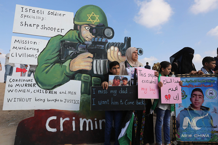 Palestinian women and children hold signs and placards carrying political slogans as they demonstrate near the border with Israel east of Gaza City on July 13, 2018. (AFP photo)