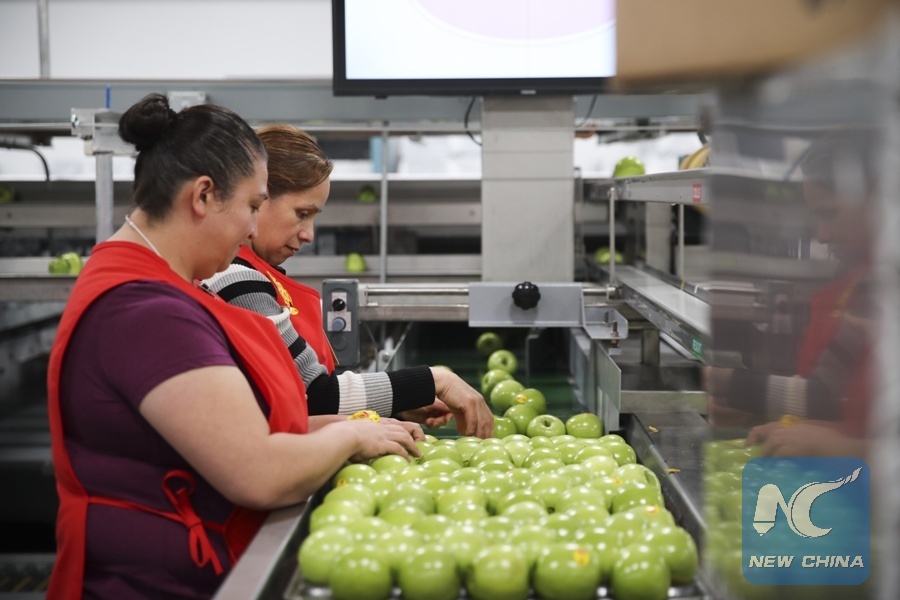 The file photo shows that workers put granny smith apples into trays on a packing line at a packing house of Auvil Fruit Company in Wenatchee, Washington State, the United States, on Nov. 3, 2017. (Xinhua/Wang Ying)