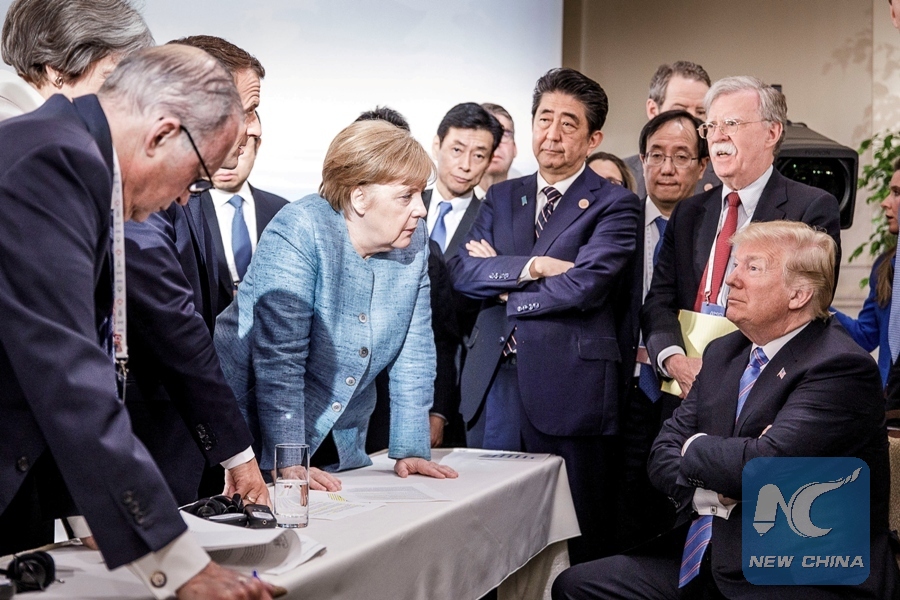 German Chancellor Angela Merkel speaks to U.S. President Donald Trump during the second day of the G7 meeting in Charlevoix city of La Malbaie, Quebec, Canada, June 9, 2018. (Bundesregierung/Jesco Denzel/Handout via REUTERS)