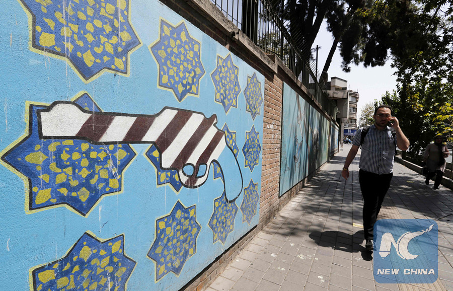 An Iranian man walks by a mural on the wall of the former U.S. embassy in the Iranian capital Tehran on Aug. 7, 2018. (AFP photo)