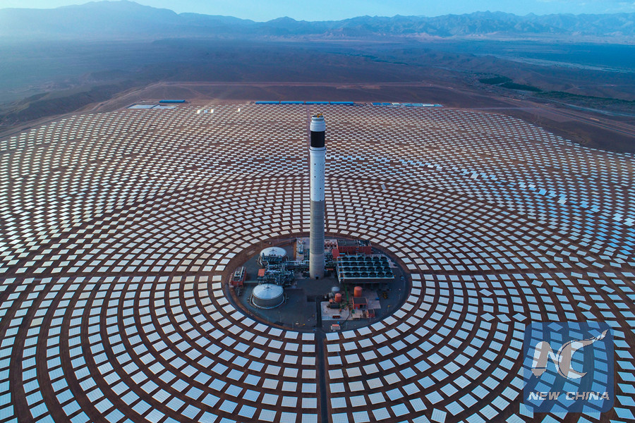 The bird's view of the Noor III Concentrated Solar Power project in Ouarzazate, Morocco, with the world's tallest solar tower standing in the middle, shot on Sept. 3, 2018. (Photo provided by China's Shandong Electric Power Construction Co., Ltd)