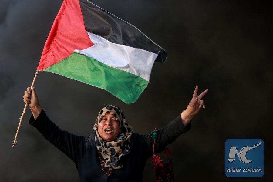 File Photo: A Palestinian woman holds a national flag as she takes part in clashes with Israeli troops on the Gaza-Israel border, east of Gaza City, on Aug. 31, 2018. (Xinhua)