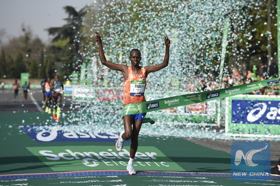 File Photo: Kenyan athlete Paul Lonyangata passes the finishing line and wins the men's champion with 2 hours 6 minutes and 25 seconds in Paris, France on April 8, 2018. (Xinhua/Jean-Marie Hervio)