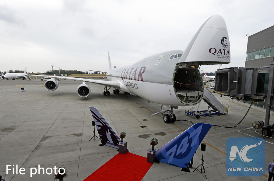 A new Boeing 747-8 freighter, with the open nose revealing the freight deck inside, stands following a delivery ceremony of the jet to Qatar Airways, Monday, Sept. 25, 2017, at Boeing's delivery center in Everett, Wash. (AP photo)