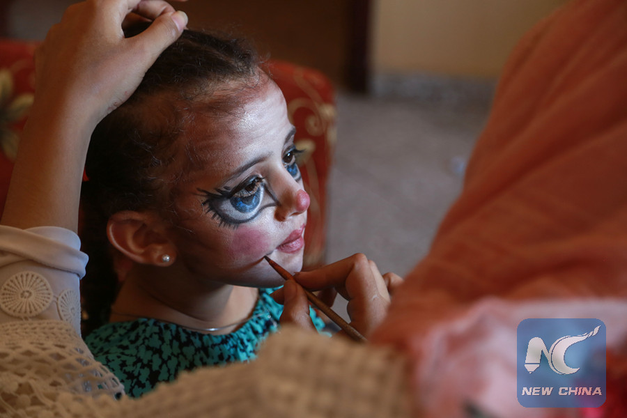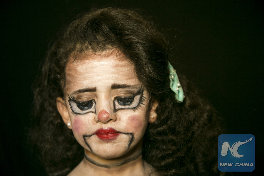 A Palestinian girl with her face painted by special effects makeup artist Alaa Abu Mustafa, 20, in the southern Gaza Strip City of Khan Younis, on Sept. 19, 2018. (Xinhua/Stringer)