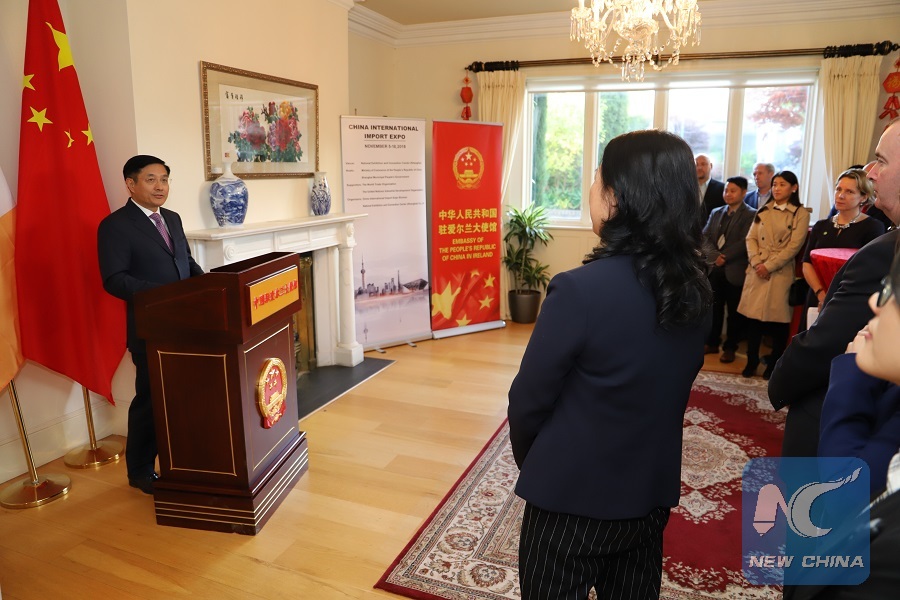 Chinese Ambassador to Ireland, Yue Xiaoyong (1st L) addresses a function at the office building of the Economic and Commercial Section of the Chinese Embassy in Ireland, on Sept. 28, 2018. A total of 27 Irish companies have confirmed to participate in the upcoming China International Import Expo (CIIE), the first of its kind ever to be held by China in its eastern coastal city of Shanghai in November, said Yue here on Friday night. (Xinhua)