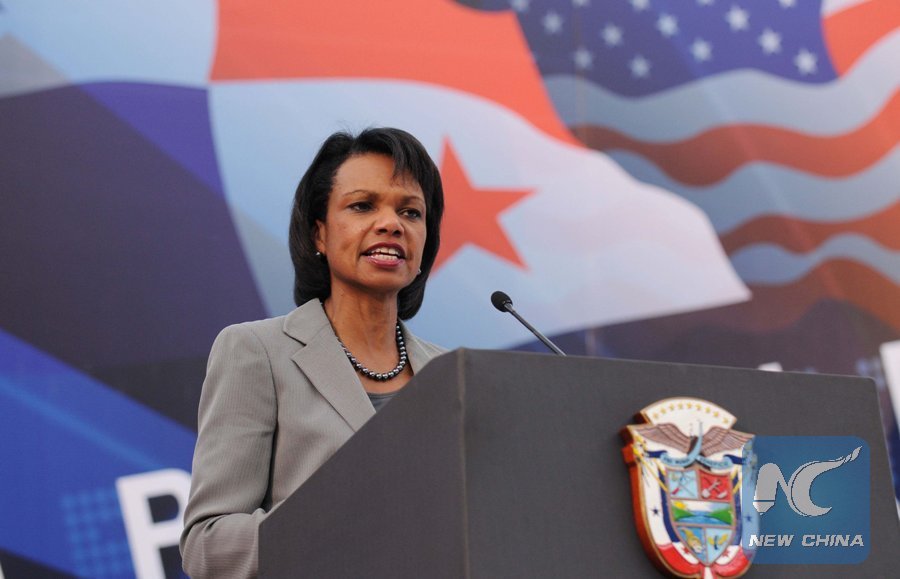 U.S. Secretary of State Condoleezza Rice speaks after signing an agreement on scholarships which will benefit Panamanian students with the Panamanian Minister of Foreign Affairs Samuel Lewis Navarro in Panama City on December 10, 2008. (Xinhua)