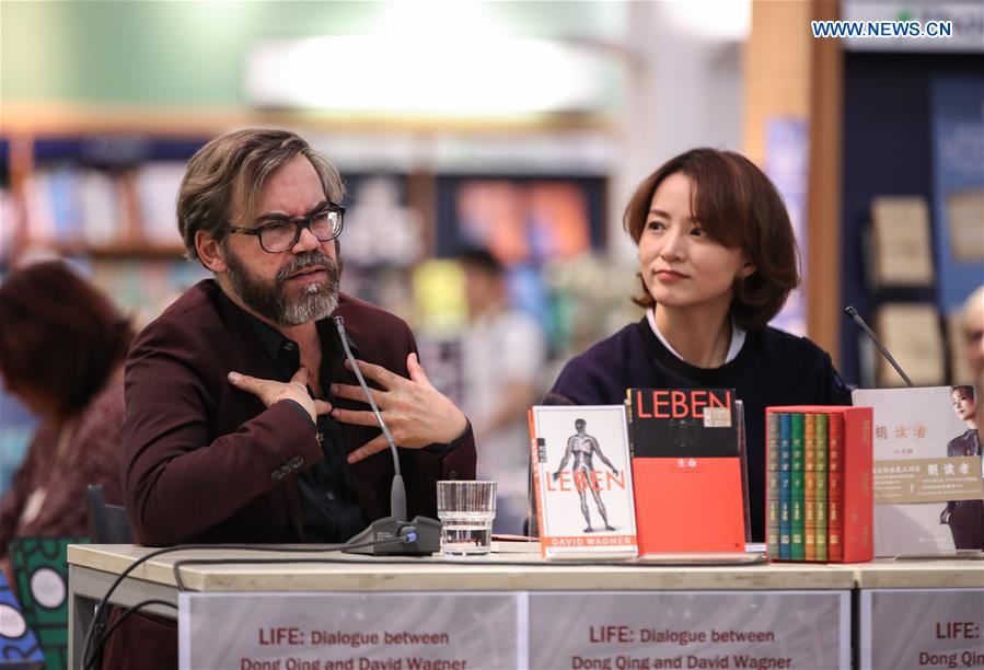 Dong Qing (R), renowned Chinese anchorwoman, the producer of the program "Readers" as well as the chief editor of the book "Readers" and German writer David Wagner attend a book reading at a Thalia bookstore in Berlin, capital of Germany, on Oct. 11, 2018. A story of a German writer about his organ transplantation and ensuing dwelling on the meaning of life met with a Chinese one here in Berlin, as a dialogue between the German writer and a famed Chinese anchorwoman took place on Thursday evening.