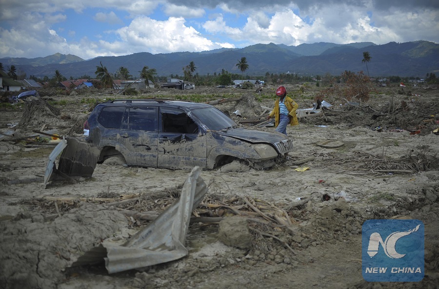 JAKARTA, Oct. 18 (Xinhua) -- A helicopter was dropping disinfectant on quake and tsunami hit areas in Central Sulawesi province, aiming to prevent diseases from spreading, a disaster agency official said here on Thursday.