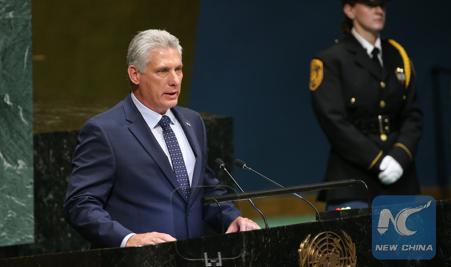 Cuban President Miguel Diaz-Canel addresses the General Debate of the 73rd session of the United Nations General Assembly at the UN headquarters in New York, on Sept. 26, 2018. (Xinhua/Qin Lang)