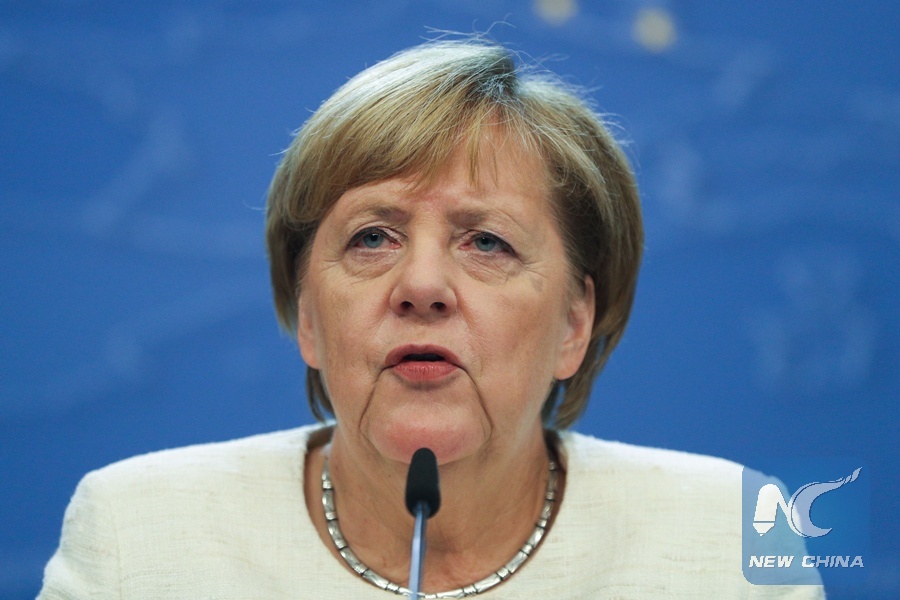 German Chancellor Angela Merkel speaks at a press conference after the EU Summit at the European Council in Brussels, Belgium, Oct. 18, 2018. European Union (EU) leaders met here on Wednesday and Thursday to discuss faltering progress in Brexit talks, ongoing immigration concerns, and internal security issues. (Xinhua/Zheng Huansong)