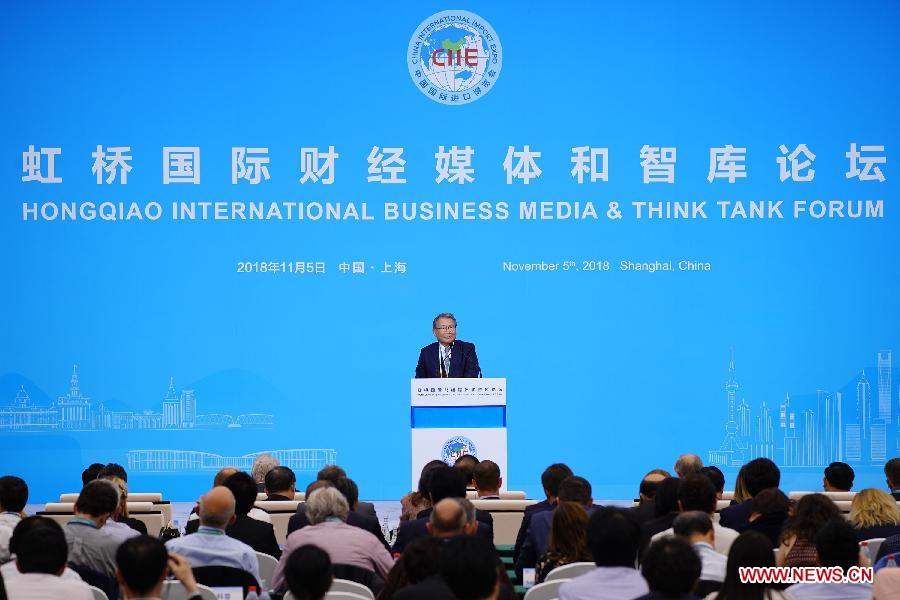 Tsuneo Kita, chairperson of Japan's Nikkei media group, speaks at Hongqiao International Business Media & Think Tank Forum in Shanghai, east China, Nov. 5, 2018. (Xinhua/Cai Yang)