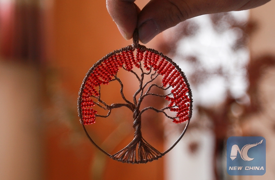 A tree of wire sculpture made by young palestinian, Mahmoud al-Nabahin, in al-Bureij refugee camp in central Gaza Strip on Nov. 6, 2018. (Xinhua/Stringer)