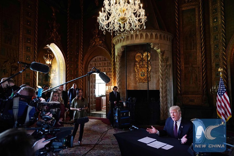U.S. President Donald Trump speaks to the press after talking to members of the military via teleconference from his Mar-a-Lago resort in Palm Beach, Florida, on Thanksgiving Day, November 22, 2018. (Xinhua/Photo by Mandel NGAN/AFP)