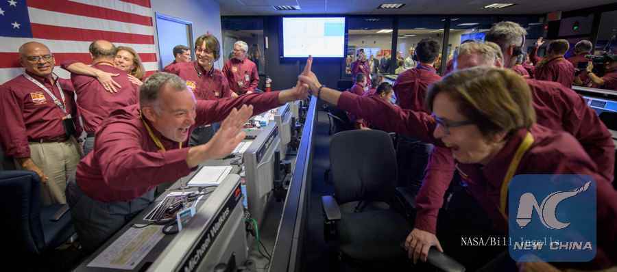 Tom Hoffman, InSight Project Manager, NASA JPL, left, and Sue Smrekar, InSight deputy principal investigator, NASA JPL, react after receiving confirmation that the Mars InSight lander successfully touched down on the surface of Mars, Monday, Nov. 26, 2018 inside the Mission Support Area at NASA's Jet Propulsion Laboratory in Pasadena, California. InSight, short for Interior Exploration using Seismic Investigations, Geodesy and Heat Transport, is a Mars lander designed to study the "inner space" of Mars: its crust, mantle, and core. (Xinhua/Credit:NASA/Bill Ingalls)