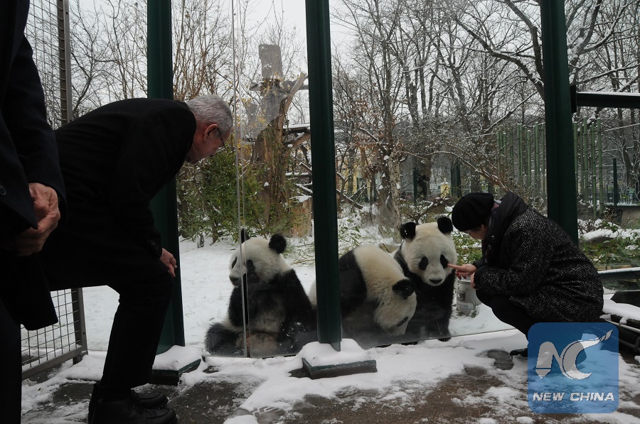 Austrian President Alexander Van der Bellen (L) looks at Giant panda Fu Feng, Fu Ban and their mother Yang Yang in the snow-covered Panda garden at Zoo Vienna in Vienna, Austria, on Dec. 1, 2018. Austrian President Alexander Van der Bellen visited the panda twins, Fu Feng and Fu Ban, at Zoo Vienna on Saturday to say goodbye as the pandas will return to Sichuan province, the hometown of giant pandas in China on Sunday. (Xinhua/Liu Xiang)