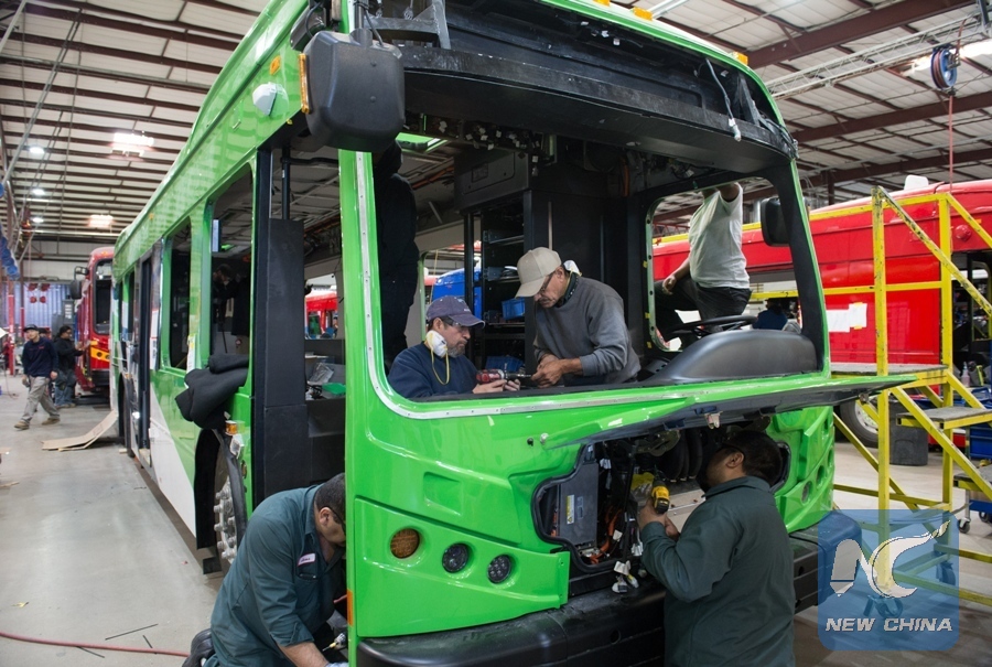 People work at the assembly workshop at the BYD factory in Lancaster, the United States, March 23, 2017. As the world's largest manufacturer of rechargeable batteries and electric vehicles, the Chinese company BYD established its factory in Lancaster, California in May 2013. (Xinhua/Yang Lei)