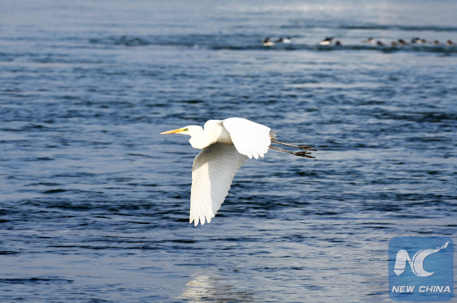A water bird flies above the Yellow River in Lanzhou, capital of northwest China's Gansu Province, Jan. 2, 2019. An increasing number of water birds are flying here to live through winter as ecological envrionment keeps improving at the upper reaches of the Yellow River. (Xinhua/Fan Peishen) XINHUA PHOTOS OF THE DAY