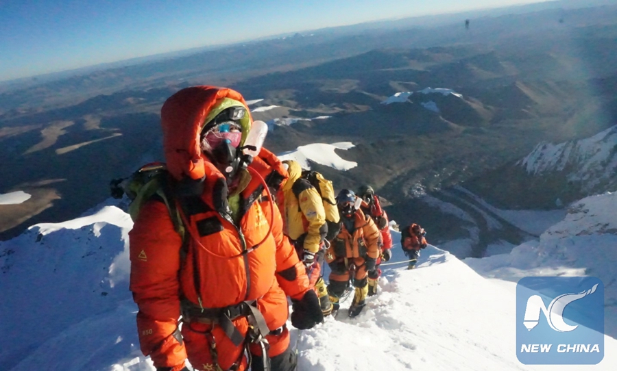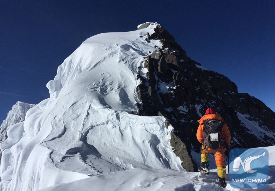 Photo taken on Sept. 29, 2018 shows Luo Jing (front) climbing Mount Shishapangma in China. (Xinhua)
