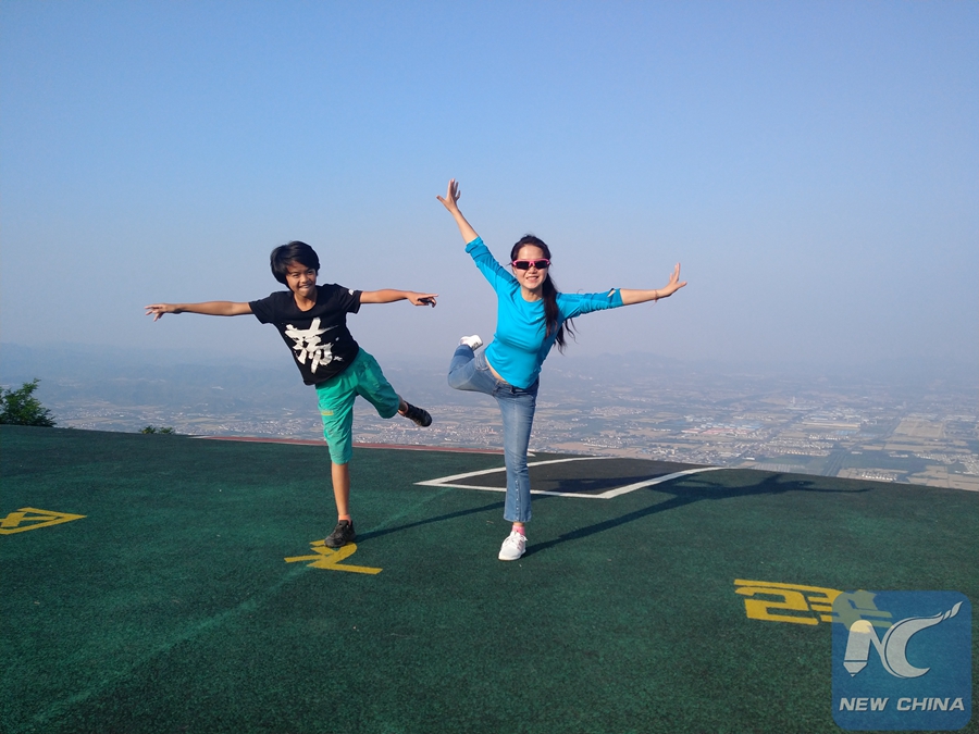 Photo taken on June 24, 2018 shows Luo Jing (R) taking her son to learn paraglider in Anyang of central China's Henan Province. (Xinhua)