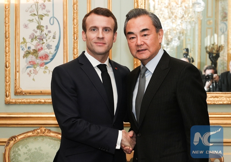 French President Emmanuel Macron meets with Chinese State Councilor and Foreign Minister Wang Yi at the Elysee Palace in Paris Jan. 23, 2019. (Xinhua/Zheng Huansong)