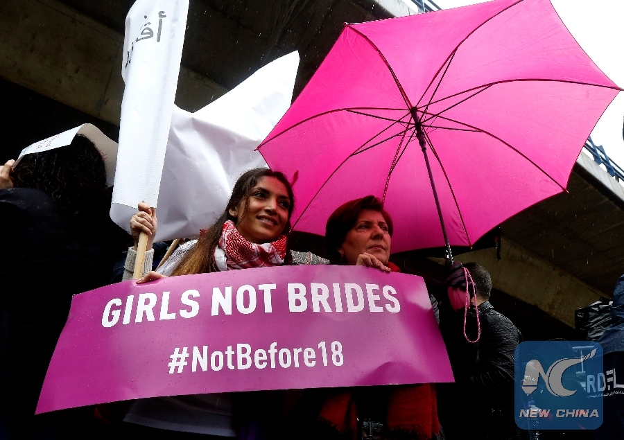 Ahead of International Women's Day, the Lebanese hold a demonstration in Beirut in protest of child marriage and pressure parliament to pass a law to make 18 the legal minimum age for marriage on March 2, 2019. (Xinhua/Bilal Jawich)