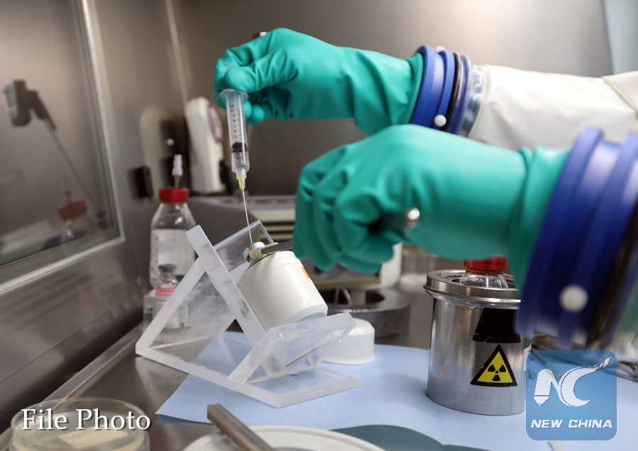 | A medical nuclear analytical assistant at the Rotterdam Erasmus Medical Center mixes a preparation of raw material Lutetium Chloride and Lutetium Octoraat, a medicine used to treat patients with a rare form of cancer, in Rotterdam, Netherlands, February 28, 2019. (REUTERS PHOTO) |