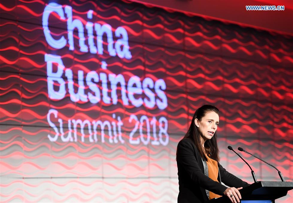 New Zealand Prime Minister Jacinda Ardern delivers a speech at the opening of China Business Summit 2018 in Auckland, New Zealand, May 14, 2018. (Xinhua/Guo Lei)