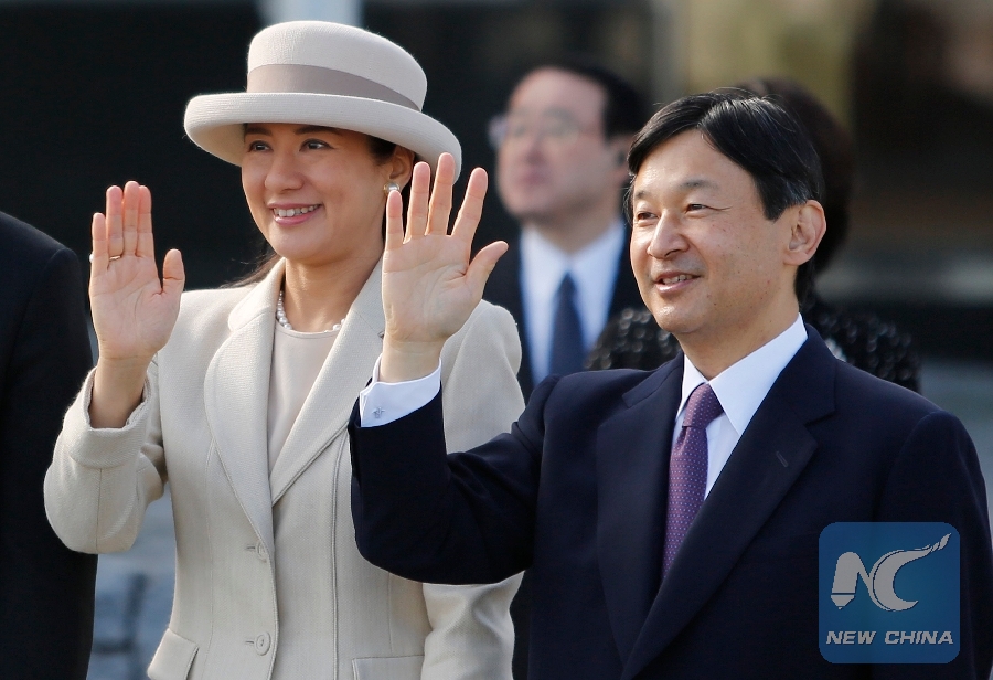 File Photo: Japan's Crown Prince Naruhito (R) and his wife Crown Princess Masako wave as they see Emperor Akihito and Empress Michiko (not pictured) off at Tokyo's Haneda airport Nov. 30, 2013. (Xinhua/REUTERS)